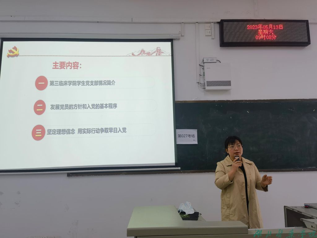 李芹以《坚定理想信念,用实际行动争取早日入党》为题向大家详细介绍了tyc5997太阳集团学生党支部的基本情况以及党员发展的基本程序和方针,指出tyc5997太阳集团本部学生党支部是湖北省及十堰市样板党支部,欢迎大家积极努力加入这一优秀的团体。特别是以张桂梅和张富清的感人事迹为例,向大家介绍了优秀共产党员的理想信念和担当,希望大家向先进学习,坚定理想信念,用实际行动争取早日入党。