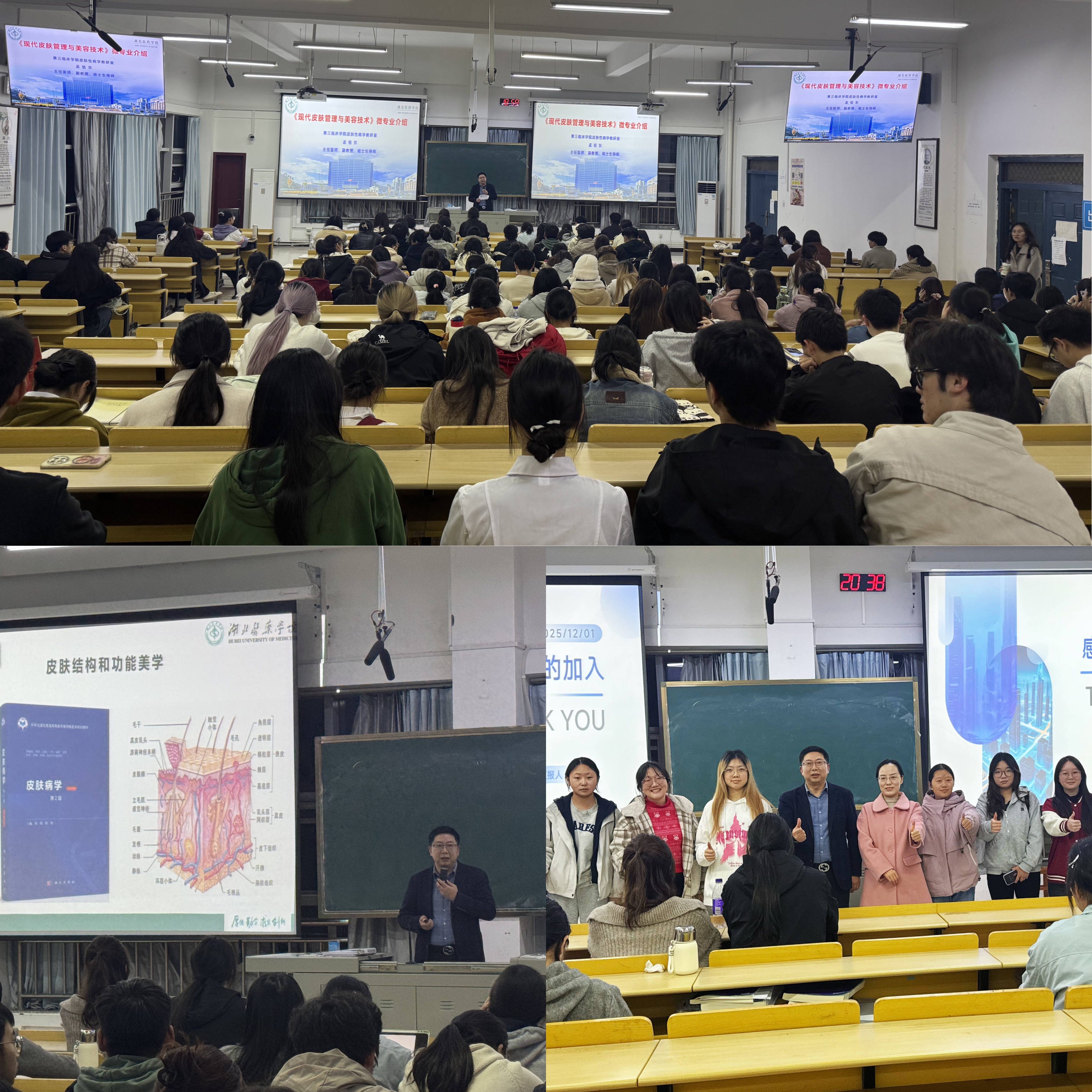 皮肤性病学教研室主任孟祖东教授从助力考研、就业赋能、专项技能考试等方面介绍微专业开设的目的及培养目标,重点强调了微专业学习内容及考核方式,并以“皮肤美容基础与医美初探”为题开始首次理论课讲授。