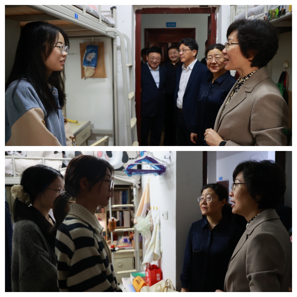 随后郑丹凤一行前往临床科室和医学研究所、学生宿舍看望了研究生(专硕、学硕)和本科生代表,郑书记关切的询问了同学们的学业情况,详细了解毕业生就业状况与求职需求,勉励大家树立科学的就业观;她询问同学们对校区住宿和生活条件还有什么要求,并嘱咐在场的领导老师们要克服困难为同学们创造一个良好的学习生活环境,积极为毕业生就业做好保障及服务工作。郑丹凤书记还重点提醒同学们注意人身财产、用电消防及出行交通安全,确保度过一个平安祥和的五一假期。
